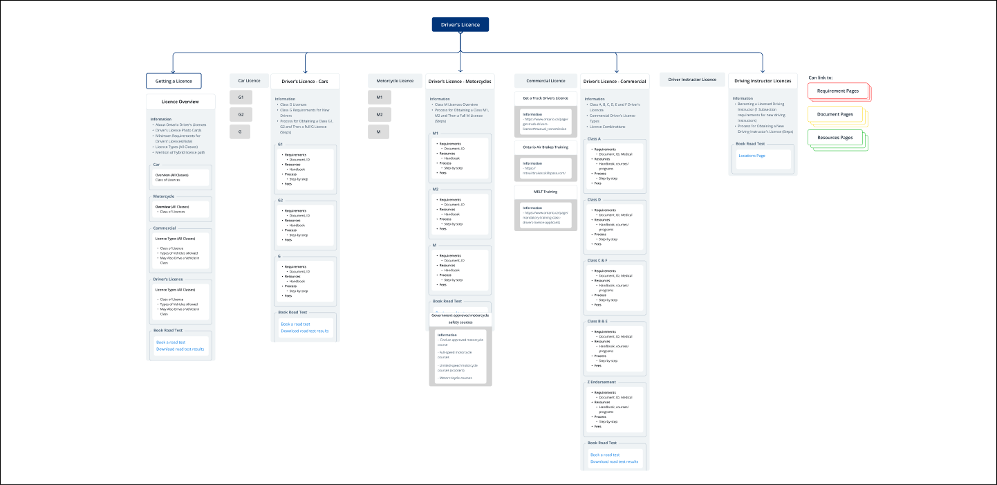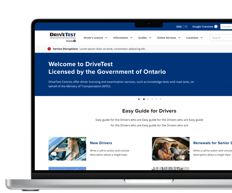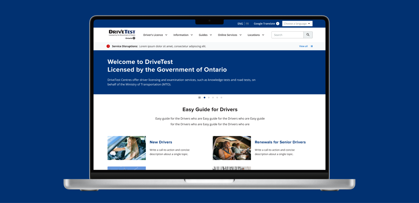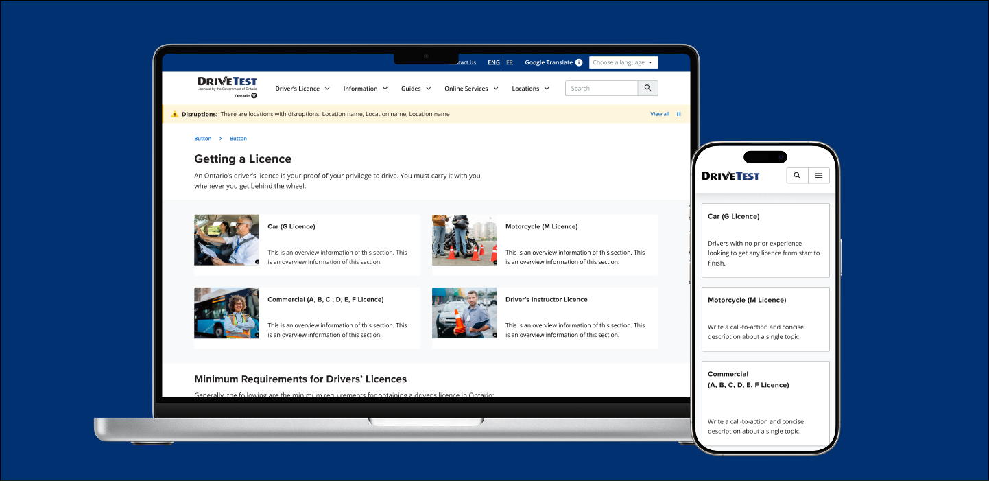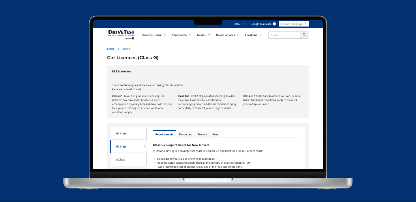 DriveTest, a government agency responsible for driver examination services in Ontario, was facing multiple pain points with their website. Users found the website’s navigation confusing, with too many pages and excessive, wordy content. There was a lack of clear direction for users, making it difficult to find essential information about driver licensing. The goal was to redesign the website with a human-centered approach that would streamline the information architecture (IA) and enhance the user experience. The main challenge was to simplify the structure, improve navigation, and ensure that users could easily access the services they needed..