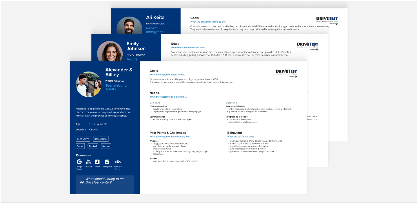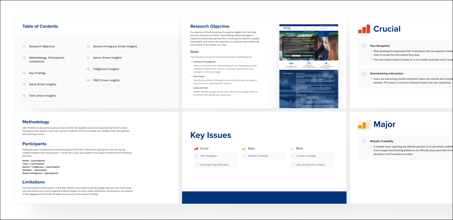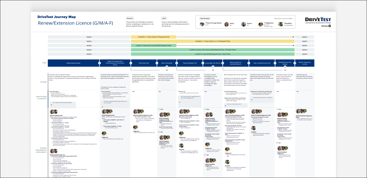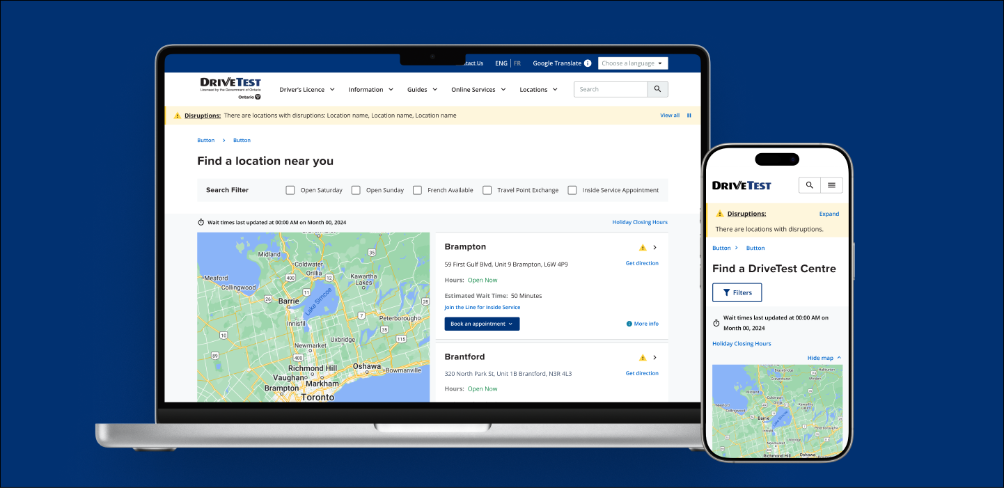 DriveTest, a government agency responsible for driver examination services in Ontario, was facing multiple pain points with their website. Users found the website’s navigation confusing, with too many pages and excessive, wordy content. There was a lack of clear direction for users, making it difficult to find essential information about driver licensing. The goal was to redesign the website with a human-centered approach that would streamline the information architecture (IA) and enhance the user experience. The main challenge was to simplify the structure, improve navigation, and ensure that users could easily access the services they needed..